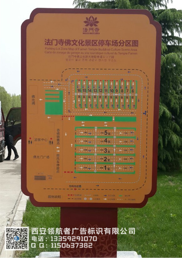 综上所述,西安标识牌制作厂家法门寺的标识牌制作中,引用了佛教的宗教之花莲花,整个标识牌的颜色也沿用了从古至今佛教寺院常用的代表高贵的深红色的黄色,标识牌的形状也是在方便受众快速认清方向位置的前提下,四角加以圆弧花瓣状。不仅简明生动的起到了标识牌的作用,而且带给受众视觉上浓郁的佛教气氛。