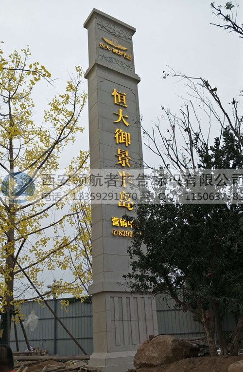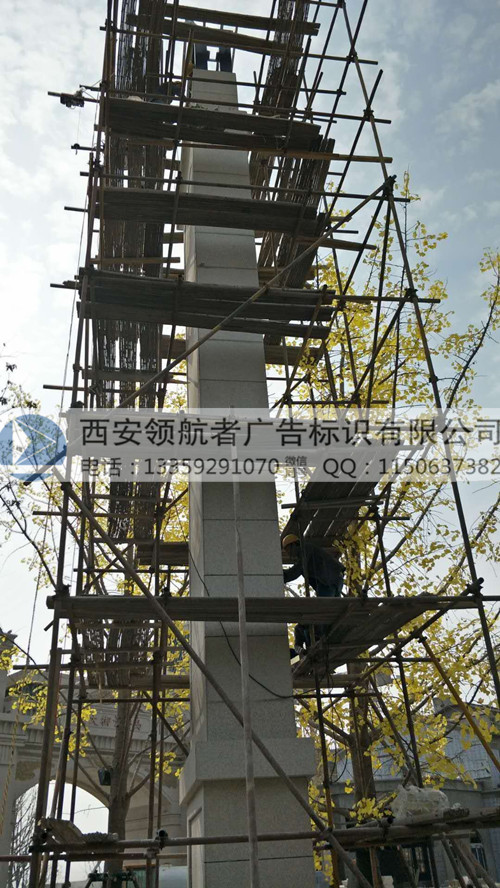 2018年初,西安领航者广告标识有限公司完成了恒大集团韩城御景半岛项目精神堡垒。一般精神堡垒多采用方管骨架,外立面则用镀锌板或者不锈钢板等金属材料蒙皮后喷漆。该精神堡垒外立面采用干挂石材表面。常用的装饰性石材有大理石和花岗岩,大理石容易风化,综合考虑安全性、成本控制及视觉效果,该精神堡垒采用了芝麻黄外观花岗岩石材。