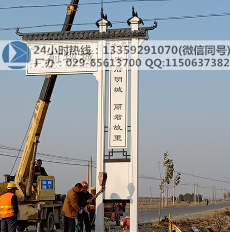 我们制作的此款村牌是采用了镀锌钢板材料,能够做出丰富造型,且适合在户外,使用寿命长,内部结构稳定,其外观仿古,有庄重、大方的气质,整体采用F造型,矗立在街道两边,距地面4.5米高,让来往的车辆能够顺利通行。文字方面我们进行了村名和方向的指引,同时在侧立面展现乡村的特色文化和历史背景。色彩根据客户的需求,我们提供了白色和红棕色两种,更凸显了大气的特征。